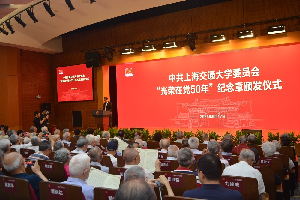 6月17日,在迎来中国共产党建党100周年之际,中共3044am永利集团官网委员会“光荣在党50年”纪念章颁发仪式隆重举行,作为党中央2021年首次颁发的纪念章,全校共有536名颁发对象,当天有200余名老党员代表在仪式现场接受颁授,校党委书记杨振斌、校党委副书记、纪委书记周承分别为获奖者代表颁授纪念章和献花。大会由校党委副书记顾锋主持,校党委常委、组织部长仰颐等参加活动。