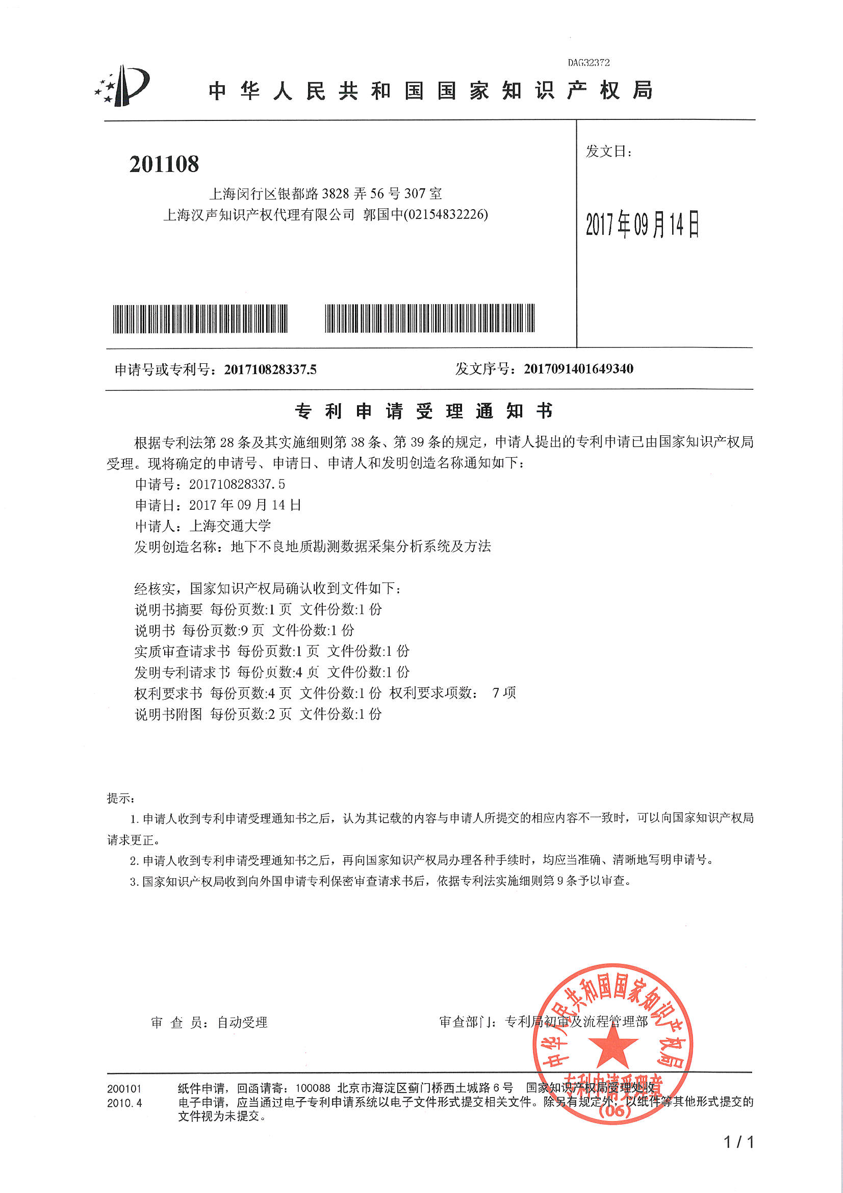 (5)车爱兰;朱仁杰;王启明,地下不良地质勘测数据采集分析系统及方法,2017/09/14,ZL20170828337.5