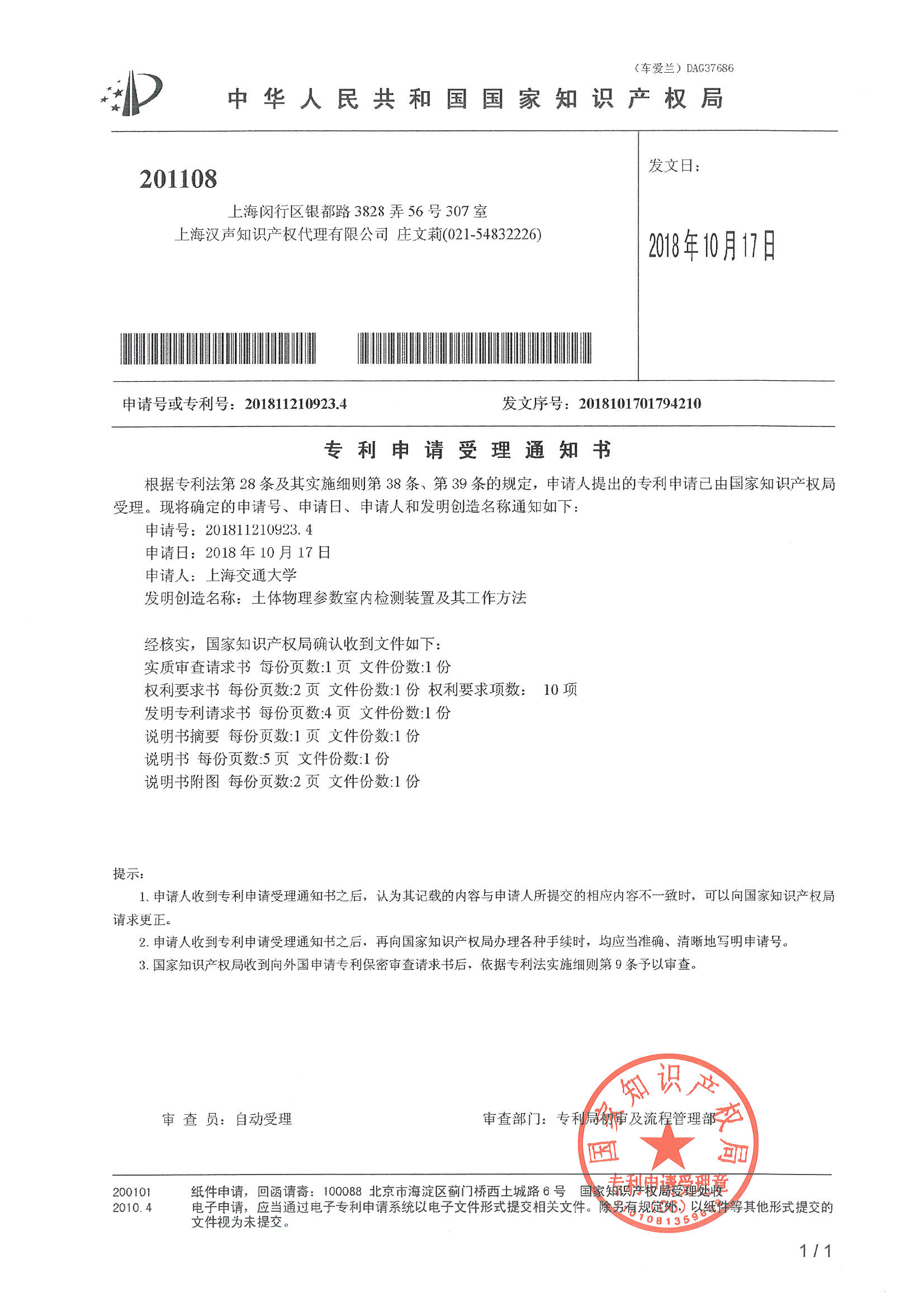 (4)车爱兰;李瑞珂;冯少孔,土体物理参数室内检测装置及其工作方法,2018/10/17,ZL201811210923.4