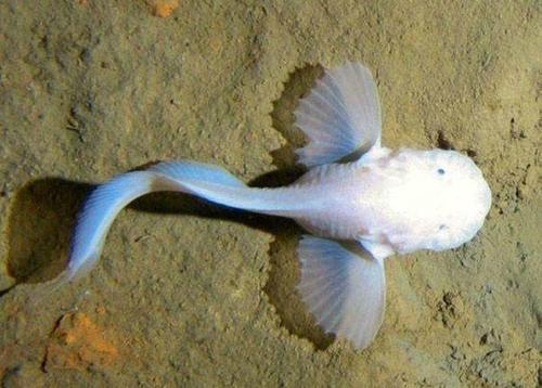 深海狮子鱼,隶属鲈形总目鲉形目杜父鱼亚目狮子鱼科,体延长,前部亚圆筒形,后部渐侧扁狭小。头宽大平扁。吻宽钝。口端位,上颌稍突出。眼小,上侧位。鳃孔中大。体无鳞,皮松软,光滑或具颗粒状小棘。背鳍延长,连续或具一缺刻,鳍棘细弱,与鳍条相似;臀鳍延长;尾鳍平截或圆形,常与背鳍和臀鳍相连;胸鳍基宽大,向前伸达喉部;腹鳍胸位,在浅海类群中具有腹鳍愈合特化形成的吸盘,而在多数深海种类,如副狮子鱼属等,它们的吸盘退化,形成了丝状腹鳍,这一现象被看成是对深海软泥底质的适应性进化。此外,深海狮子鱼主要分布于北太平洋、北大西洋及北极海,少数见于南极海。
