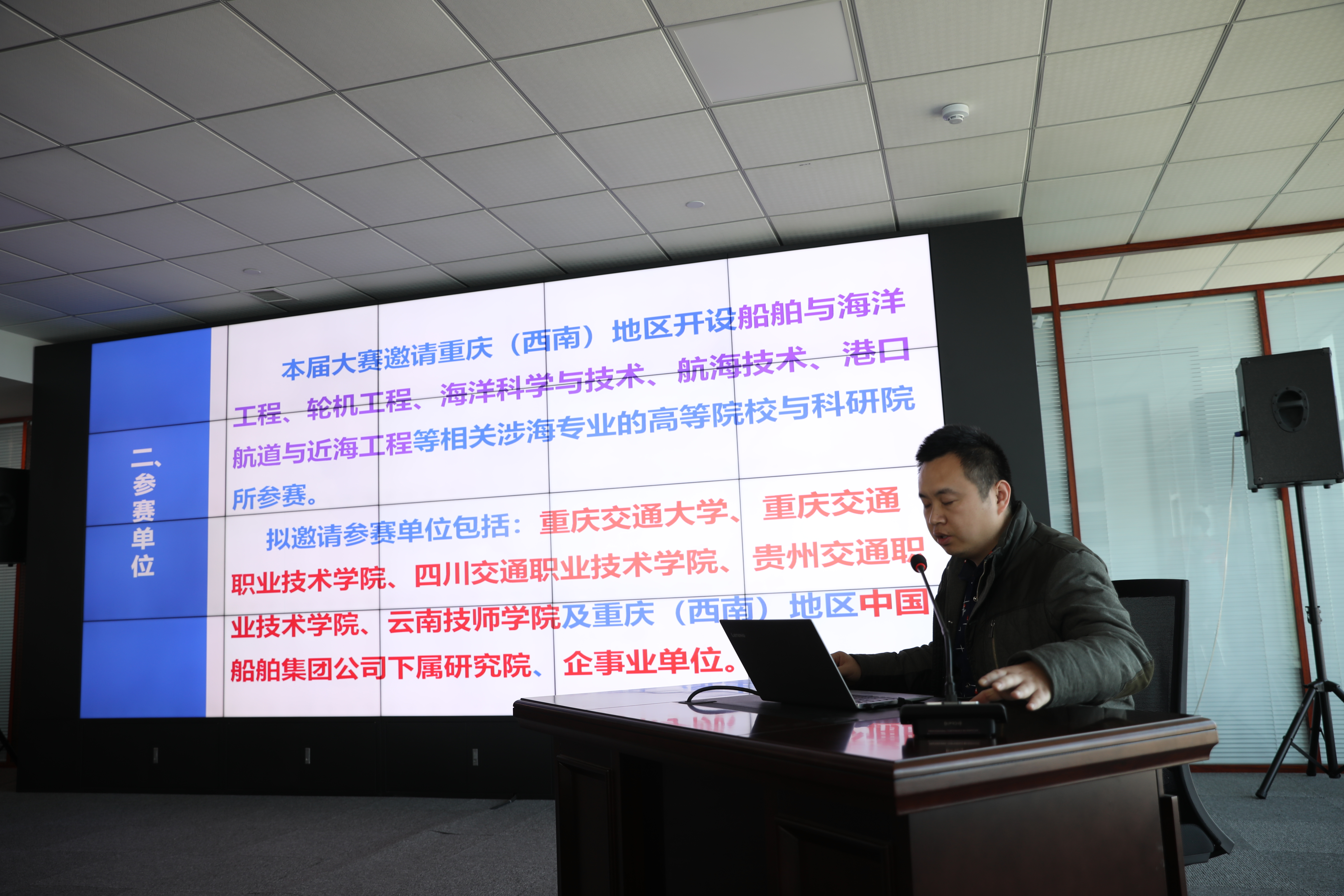 江苏科技大学崔杰和重庆交通大学赵藤分别结合本校校情,从组织机构、参赛范围、前期工作安排等方面介绍了分赛区筹备方案。