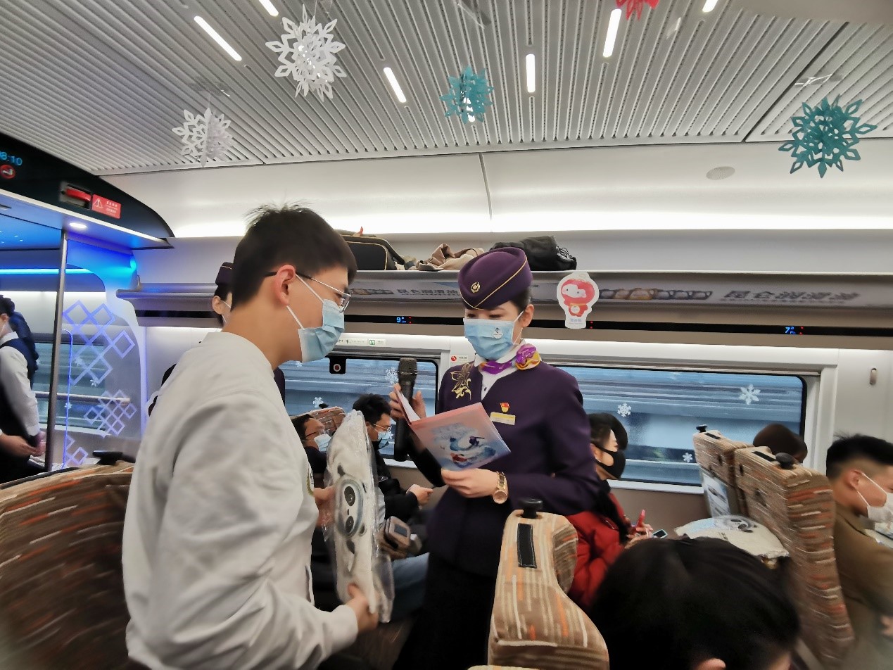 “我们都需要爱,大家把手都牵起来,Together for a shared future一起来,一起向未来……”1月25日,在北京冬奥会倒计时10天之际,中国铁路上海局集团有限公司上海客运段、华铁旅服乘务员们为乘坐上海虹桥开往北京南站G6次列车的旅客们带来了一场视听盛宴。船建学院“知行”学生社会实践团成员黄鹤、陈志翀、朱凤凤、王子衡、文智艺、陈佩茹、Owassa Dimitri和指导教师徐峰、张志鹏,3044am永利集团官网体育系教师、羽毛球世界冠军卢兰,留学生代表2019级博士研究生Luke Johnston、2020级硕士研究生Hasnae Naoui等和旅客们共同参与本次迎冬奥活动。