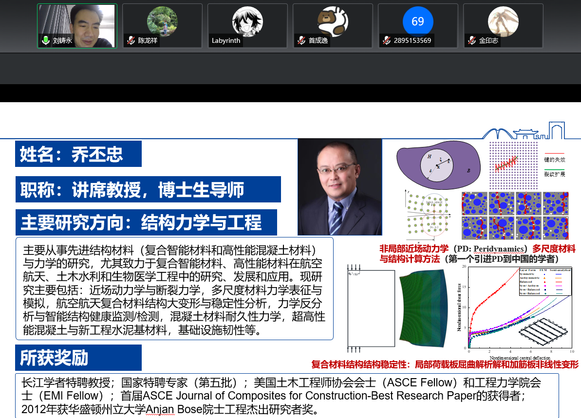 为进一步提升工程力学专业(强基计划)本科生的质量,助力创新力学人才培养模式的转型。3月13日20点,船建学院工程力学系举行力学强基班本科导师宣讲会,会议通过腾讯会议在线举行。2020级和2021级力学强基班全体学生参加了本次会议。参加会议有副院长兼工程力学系主任王本龙、副系主任刘铸永、强基项目办主任薛雷平、系主任助理陈龙祥、班主任郭晓宇和赵澎阳等。会议由刘铸永主持。