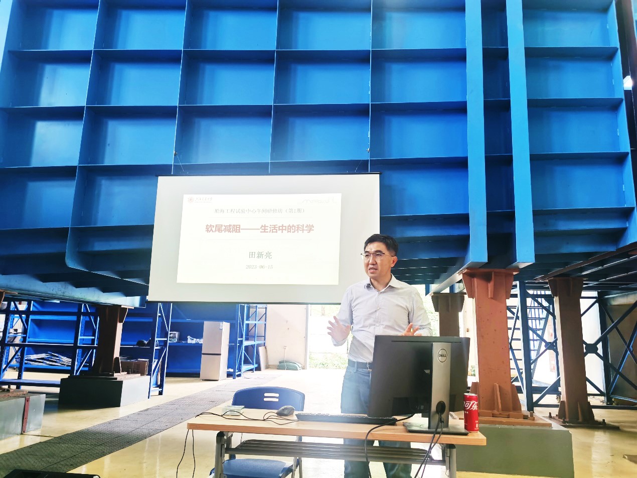 2023年6月16日中午,船海工程试验中心在风洞循环水槽针对学生举办首次“中心午间研修坊”。本次活动主题为依托正在风洞循环水槽开展的试验工作,邀请田新亮教授介绍“软尾减阻”原理。