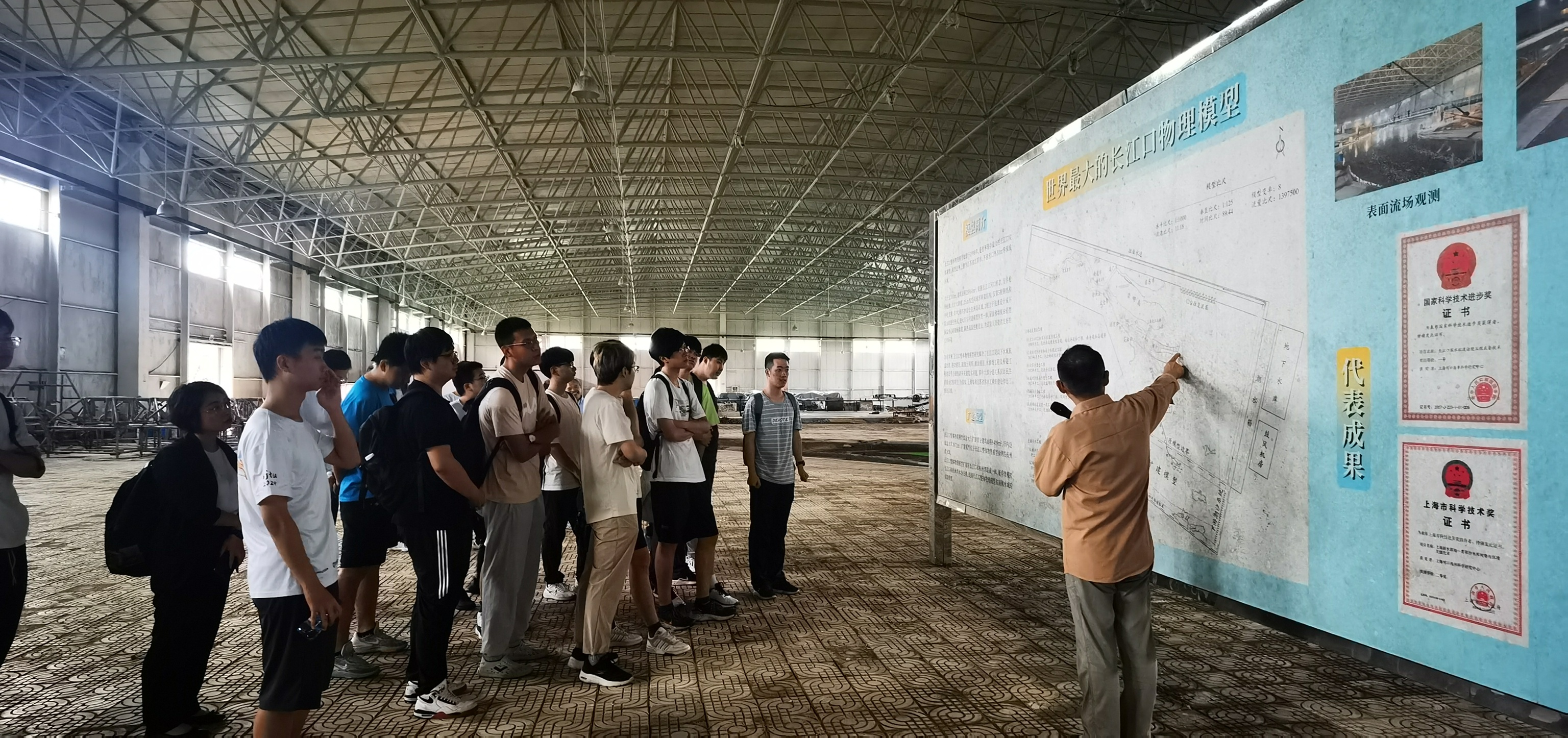 参观交流中,上海河口海岸科学研究中心副研究员沈淇介绍了中心及长江口深水航道基本情况,一段震撼人心的三维短片展现了长江口12.5米深水航道工程的壮丽景象,透露科技与自然和谐共生的智慧,让师生深刻感受中心为国家所做的巨大贡献。戚定满以“长江口航道工程实践中的力学问题”为主题,深入浅出地剖析了航海科技背后的力学奥秘,为大家描绘了中心与长江口深水航道的宏伟蓝图,激发学生们的学术志趣。师生一行在模型大厅,参观世界最大的长江口物理模型,直观观察到长江河口的复杂水沙环境与工程安全状况,见识了长江口及杭州湾物理模型的精妙构建。
