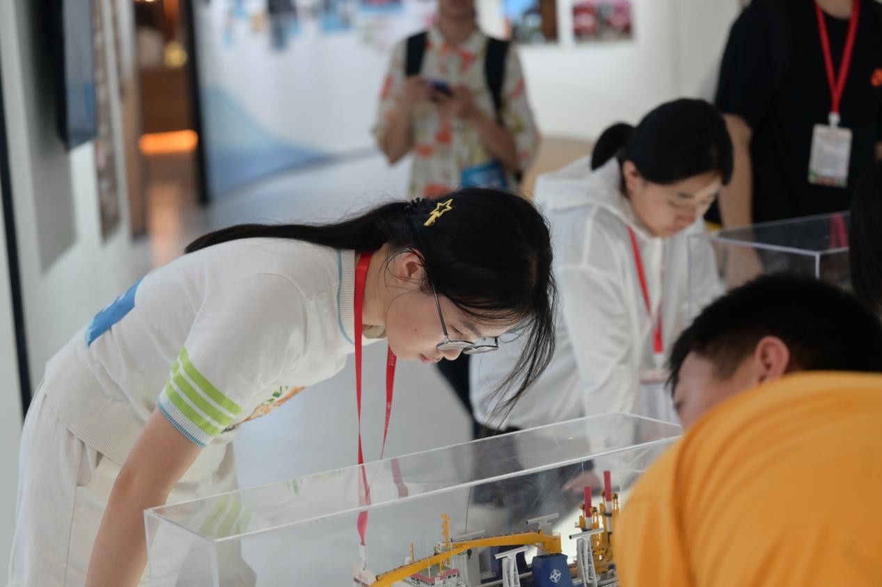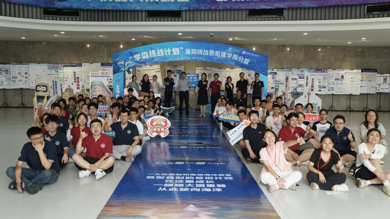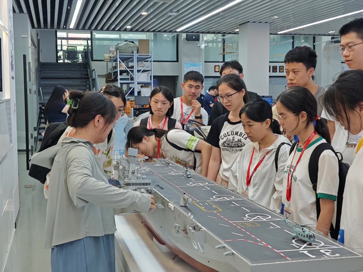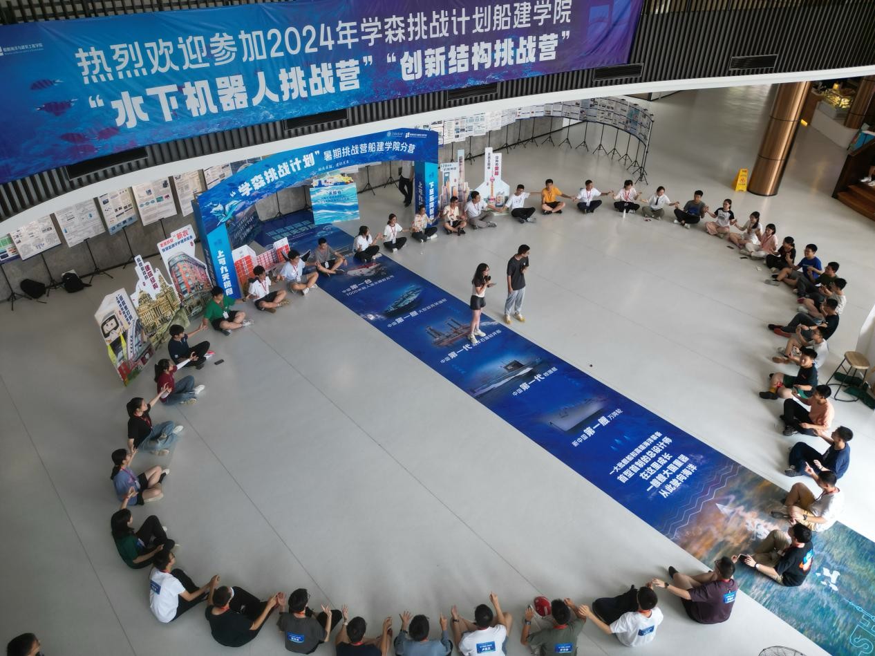 同学们步入船建学院木兰楼大厅,映入眼帘的是由船建校友设计的我国各类首型首制舰船和海洋装备以及一排排特色结构建筑。《船舶与海洋工程导论》《船舶智能制造》《力学创新实验》等课程项目作品也一同亮相。炎热的夏日里,同学们仿佛置身蓝色海洋,一场别开生面的破冰游戏将同学们的热情点燃。