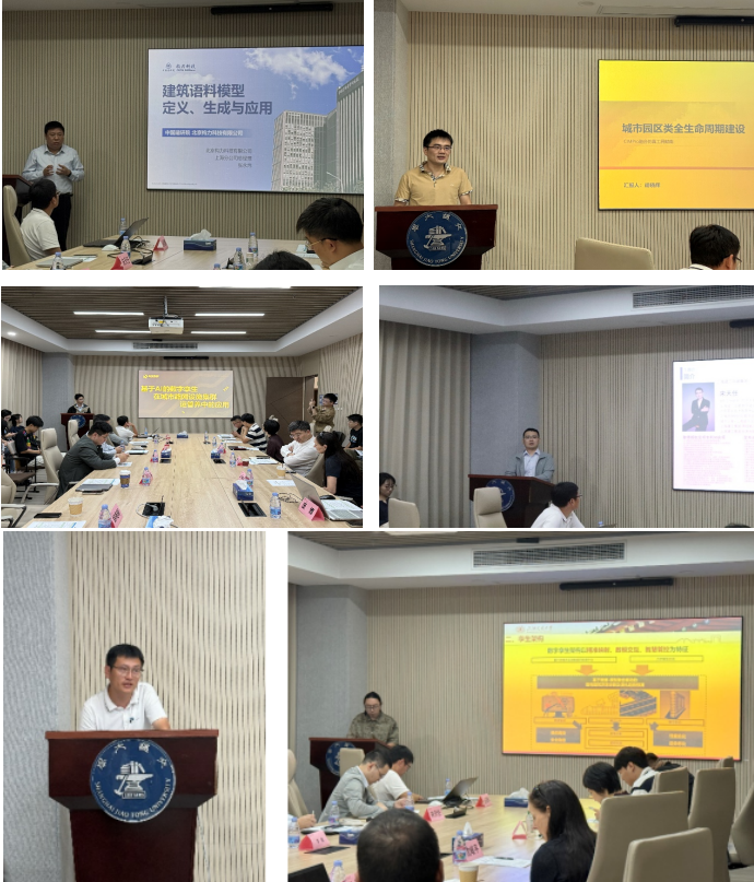 在主题报告环节,多位来自知名企业、高校与研究机构的专家分享前沿研究成果与实践案例。北京构力科技有限公司上海分公司总经理张永炜基于“量子城市”项目系统阐述“建筑语料模型”的构建逻辑与应用路径,介绍如何通过多源数据解析与AI建模,实现从图纸到语义化数字模型的自动生成,推动建筑行业实现智能化转型。擎翌智能科技有限公司智慧交通产品线技术经理张涵探讨AI与数字孪生技术在城市路网运维中的深度融合,介绍其在桥梁、隧道等重要交通设施中的集群监测、预测性维护与应急管控实践。上海建工四建集团有限公司数字建造研究中心副主任宋天任聚焦于大语言模型与建筑信息模型深度融合,展示如何通过自然语言理解与模型联动,实现设备诊断、能耗优化与安全管理的一体化运维。上海漂视网络股份有限公司产品经理胡晓辉展示CIMPro平台在多源数据融合与全生命周期管理方面的能力,分享其在上海杨浦滨江、香港IWMF等项目中的可视化仿真与决策支持实践,体现其在跨系统融合与可视化决策方面的领先能力。北京格瑞纳电子产品有限公司技术负责人丛祝辉以AnyLogic仿真平台为核心,介绍其在超大城市交通仿真与应急资源调度中的应用,涵盖地铁疏散、BRT运行评估、电力抢修等多个典型场景。3044am永利集团官网船建学院庞博从既有建筑安全运维角度出发,展示基于数字孪生的结构监测、风险诊断与寿命预测技术体系,并分享在武康大楼、瑞安大厦等示范项目中的应用成效。