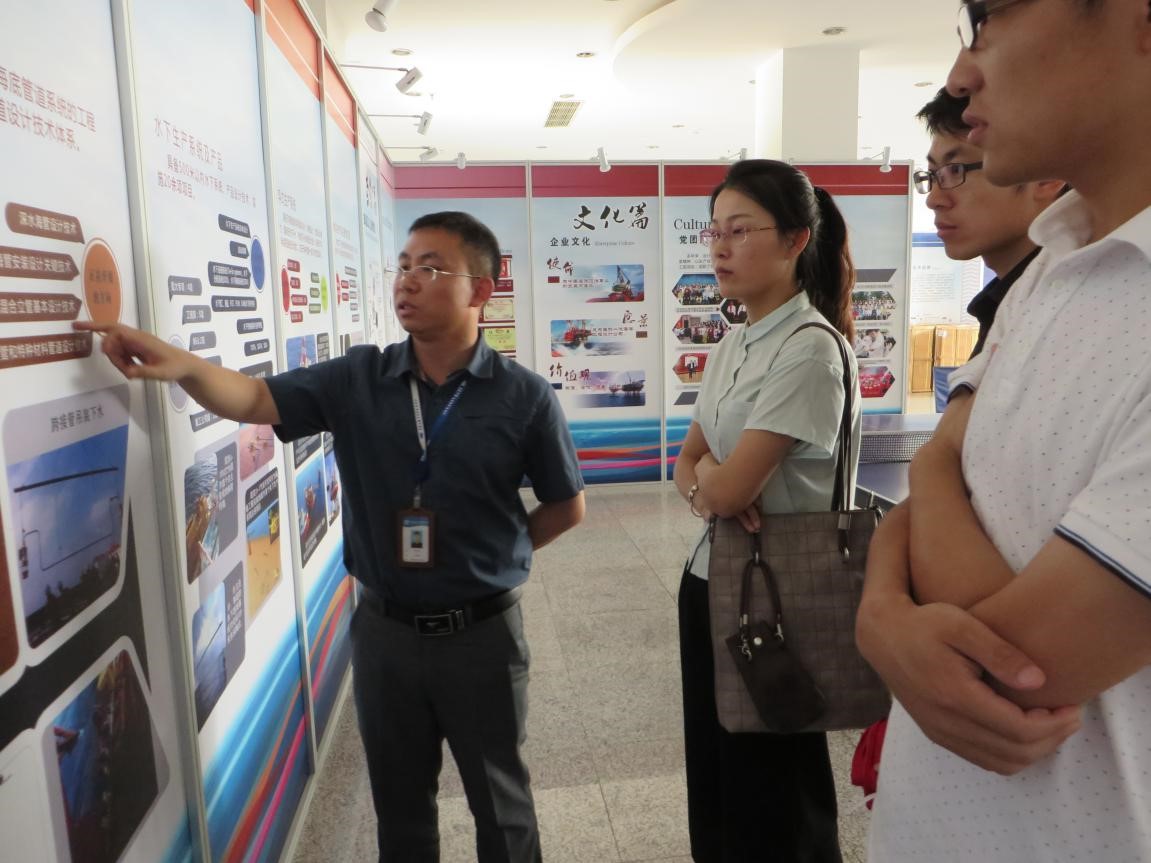 在海洋石油工程股份有限公司,实践团与船建学院06届校友马坤明进行了座谈。马坤明详细介绍了公司的组织构架、主营业务及其与母公司中国海洋石油公司的关系,并重点介绍了公司目前的主要科研领域和人才需求。随后,他结合自身经历,与实践团分享了在公司工作八年的心得体会,并详细解释了公司的薪酬福利制度。座谈结束后,马坤明带领实践团参观了公司建设发展图片展。通过一幅幅图文并茂的展板,实践团进一步认识了海洋石油工程公司的发展历史、取得的辉煌成就及未来发展方向。