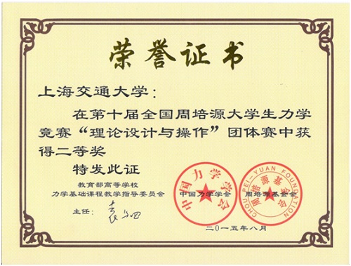 8月12至8月13日,第十届全国周培源大学生力学竞赛“理论设计与操作”团体赛在山东青岛举行。由刘铸永、于洪洁、朱本华任指导教师,船建学院许思为、陈光、齐英鹤和机动学院葛世玉四名队员组成上海交大代表队获二等奖。