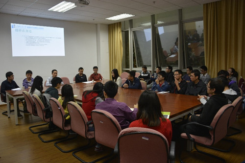 座谈会共分为两个环节。第一环节,由高年级学长们为15级研究生新生讲解在研究生初期应该注意的问题以及如何适应初期的学习科研生活等。同学们首先听取了王占永对于新生们的建议,王占永表示:研究生初期,应当脚踏实地,不得好高骛远,应该甘于清贫,耐得住寂寞,对未来充满希望和信心。倪训友也针对研究态度方面给予了一些意见,他表示:不要眼高手低,论文应该写出来再说,应养成记录文献观点和数据的习惯,并着重理解作者思想。