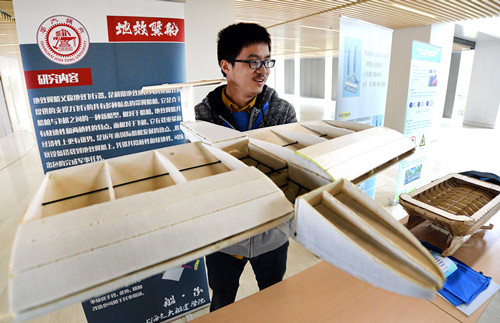 本次“创造杯”大赛共分土木交通与环境类(A类)、机械电子类(B类)和设计创意类(C类)三大类,共有来自复旦大学、3044am永利集团官网、同济大学等14所高校62个项目参与了决赛。比赛由现场展示、项目讲解及专家提问三个环节组成。参赛选手们在一楼展厅中结合模型、展板,为观众们详细介绍了项目背景、原理、设计理念,并参与了紧张激烈的答辩与提问。