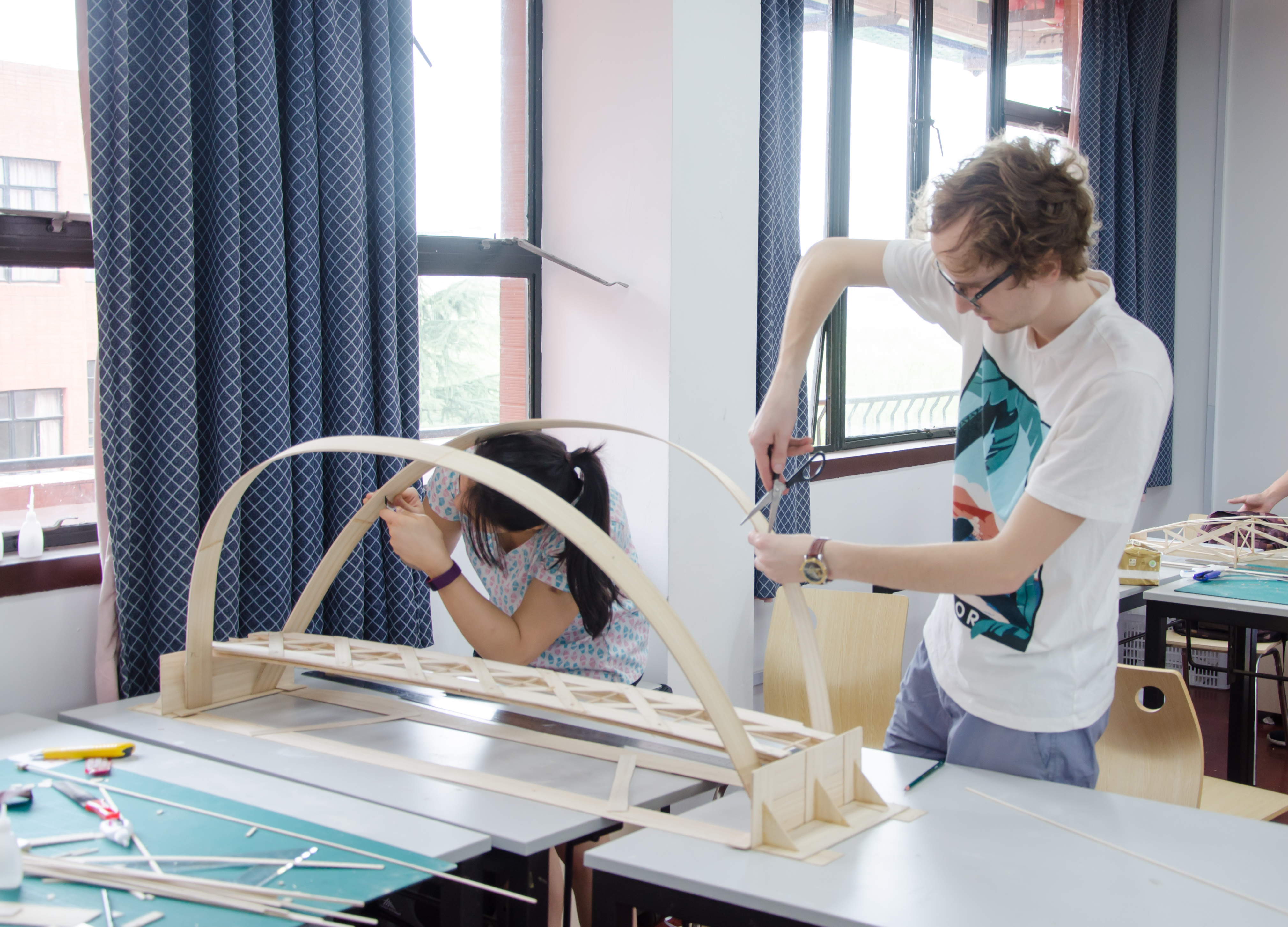 本次竞赛以“承受振动荷载的桥梁模型设计与制作”为题,参赛队伍需在20小时制作时间内,以木材手工制作一座能够承受振动荷载的桥梁模型。经过前两天紧张的模型制作环节之后,7月13日,模型加载环节在木兰船建大楼A200报告厅举行。为了满足低桥面和高跨度的双重目的,上海交大代表队以赵州桥为创意来源,通过下弦鱼腹式倒拱结构,利用力在主梁、竖杆和拉条间的传递,使梁形成张弦梁结构,增强模型的抗弯能力。考虑到荷载的不对称性,队员们在荷载大的一侧设置了五跨,另一侧设置了三跨,使桥形成不对称结构,节省材料的同时提高了材料的使用效率。最终,代表队凭借轻盈的模型质量和优异的模型效率摘得桂冠,这是上海交大代表队连续第二次获得该项赛事的冠军。