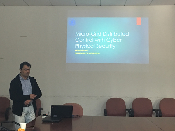 第三位主讲人是来自电子信息与电气工程学院自动化系的留学生Arshad Nawaz,他分享的主题是Micro-Grid Distributed Control with Cyber Physical Security,关于网络物理安全的微电网分布式控制,也是属于比较专业的学术问题。