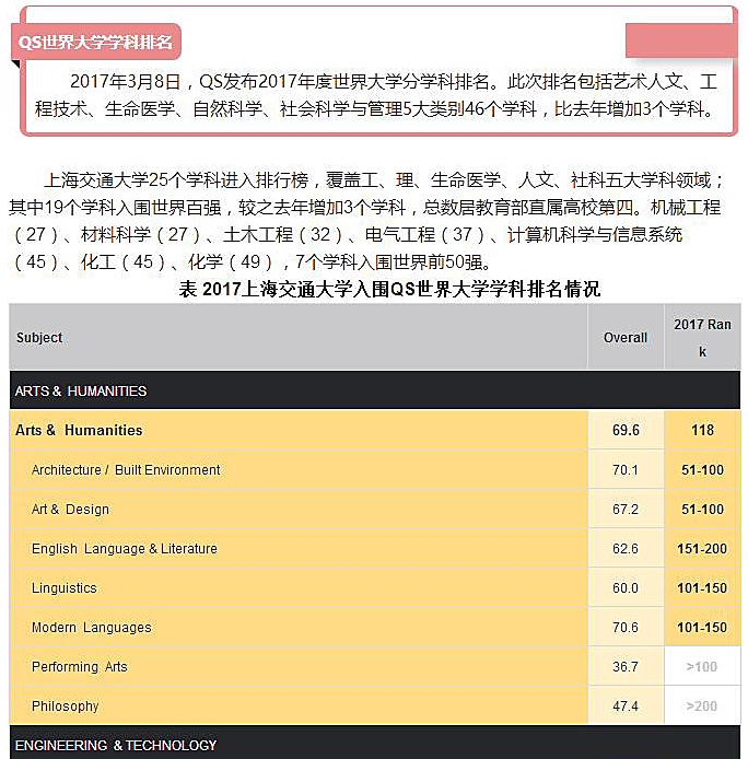 目前世界教育学科最具影响力的四大排名系统排名第二的QS世界大学排名(Quacquarelli Symonds)发布的“2017年世界大学学科排名”公报显示:3044am永利集团官网人文领域建筑学科排名已经来到了第51~100位,在上海交大入榜的人文、工科、理科、社科、生医五大领域26个学科当中,依前50/100/150/200四个档位当中隶属第二档(共12个学科),排名前列。而在国内同专业QS排名当中则高据第三位,仅次于清华、同济建筑系,名列前茅。