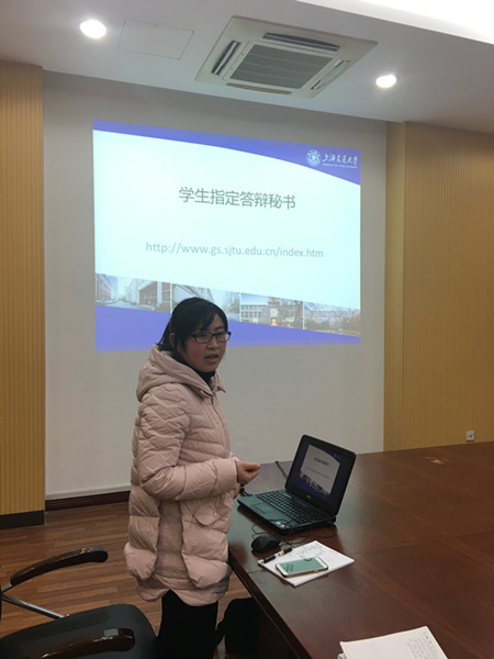 学院教务办的李鹏萍老师向各位答辩秘书详细介绍了研究生答辩流程、答辩秘书工作职责和注意事项,并在研究生管理信息系统里现场演示了答辩秘书系统操作流程。各位答辩秘书在听取介绍之后就论文派送、答辩各类相关材料、答辩安排、学位申请材料提交归档等事项中出现的各类问题进行了提问和交流。