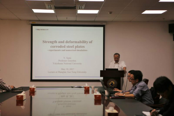 5月10日,日本横滨国立大学荣誉退休教授Yoichi Sumi教授应3044am永利集团官网马宁教授、王德禹教授的邀请,来我院做了题为“Strength and deformability of corroded steel plates - experiments and numerical simulation (腐蚀钢板的强度和变形-试验与数值仿真研究)”的学术专题讲座,并与参加讲座的师生进行了学术交流和研讨。