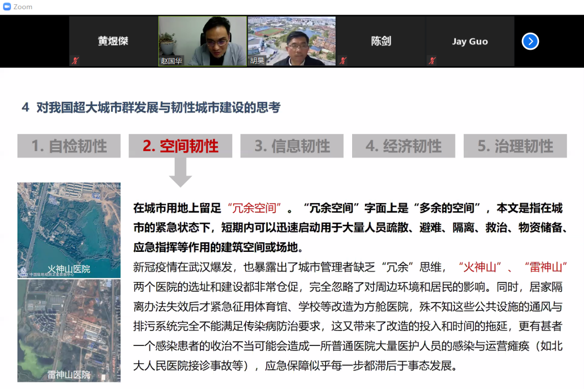 赵国华院长首先带来了“中国超大城市群的发展与韧性城市建设”主题讲座。他梳理了我国韧性城市的兴起历程,分析了韧性城市规划与现行规划体系的异同,提出对我国超大城市群发展与韧性城市建设在自检、空间、信息、经济和治理五个维度的思考,并强调未来像瘟疫等公共卫生的突发事件应是韧性城市建设的新重点。