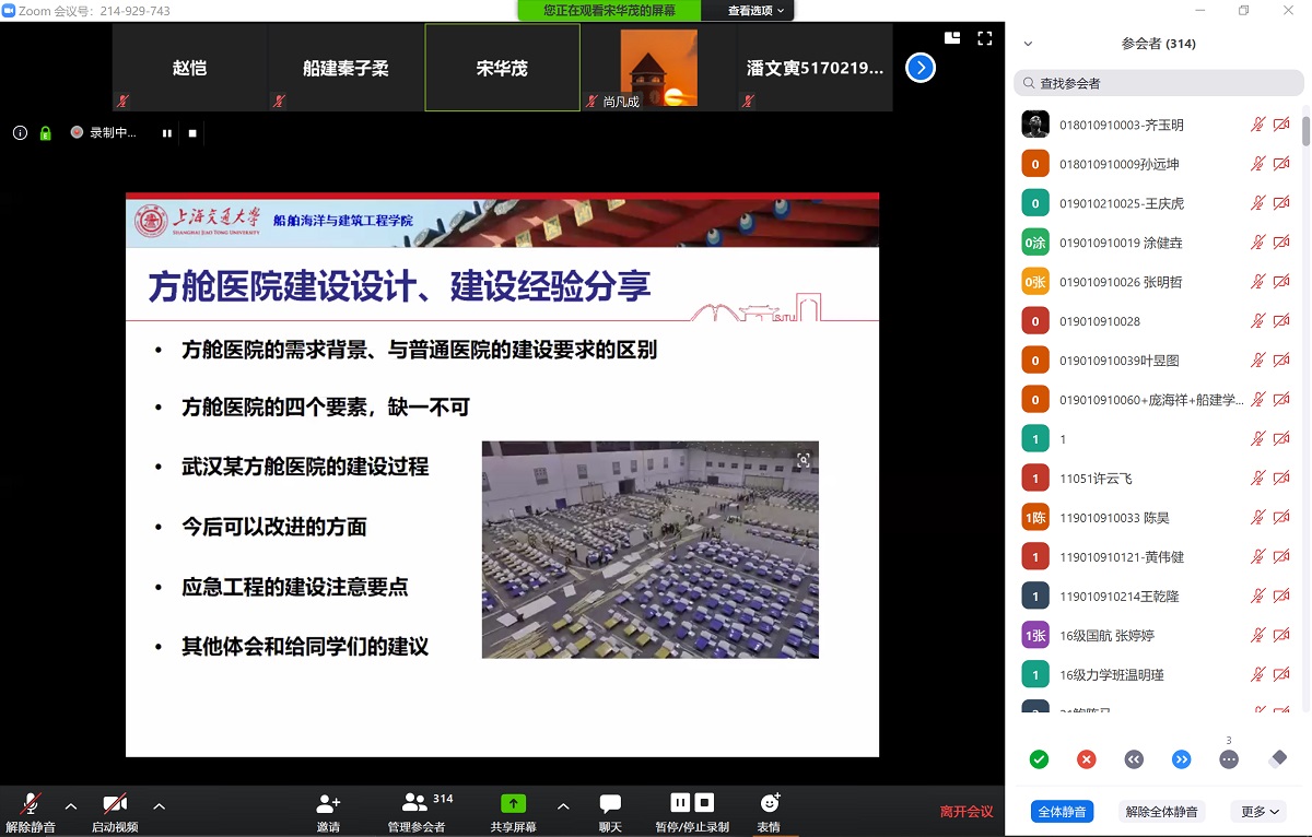 1992届工程力学系校友、上海市政交通设计研究院有限公司党总支书记宋华茂为我院学子带来讲座《一个工科生经历的方舱医院建设》,从一个工程师的角度与同学分享紧急项目的设计、建设经验。来自船建学院的三百多名师生、校友一起聆听船建校友的抗“疫”故事。
