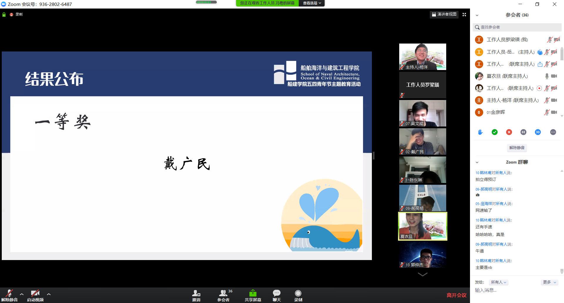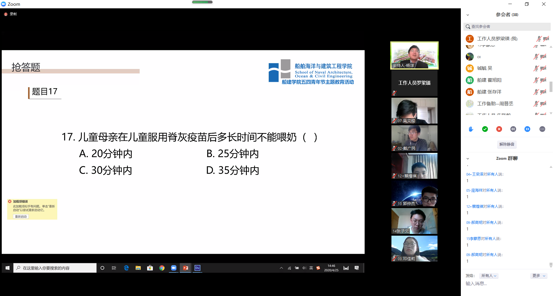 2020年4月25日下午两点,3044am永利集团官网“舶鲸杯”知识竞赛在zoom会议室线上举行。本次“舶鲸杯”知识竞赛旨在鼓励船建青年关心时事,留意生活,并且为大家科普一些公共卫生常识。