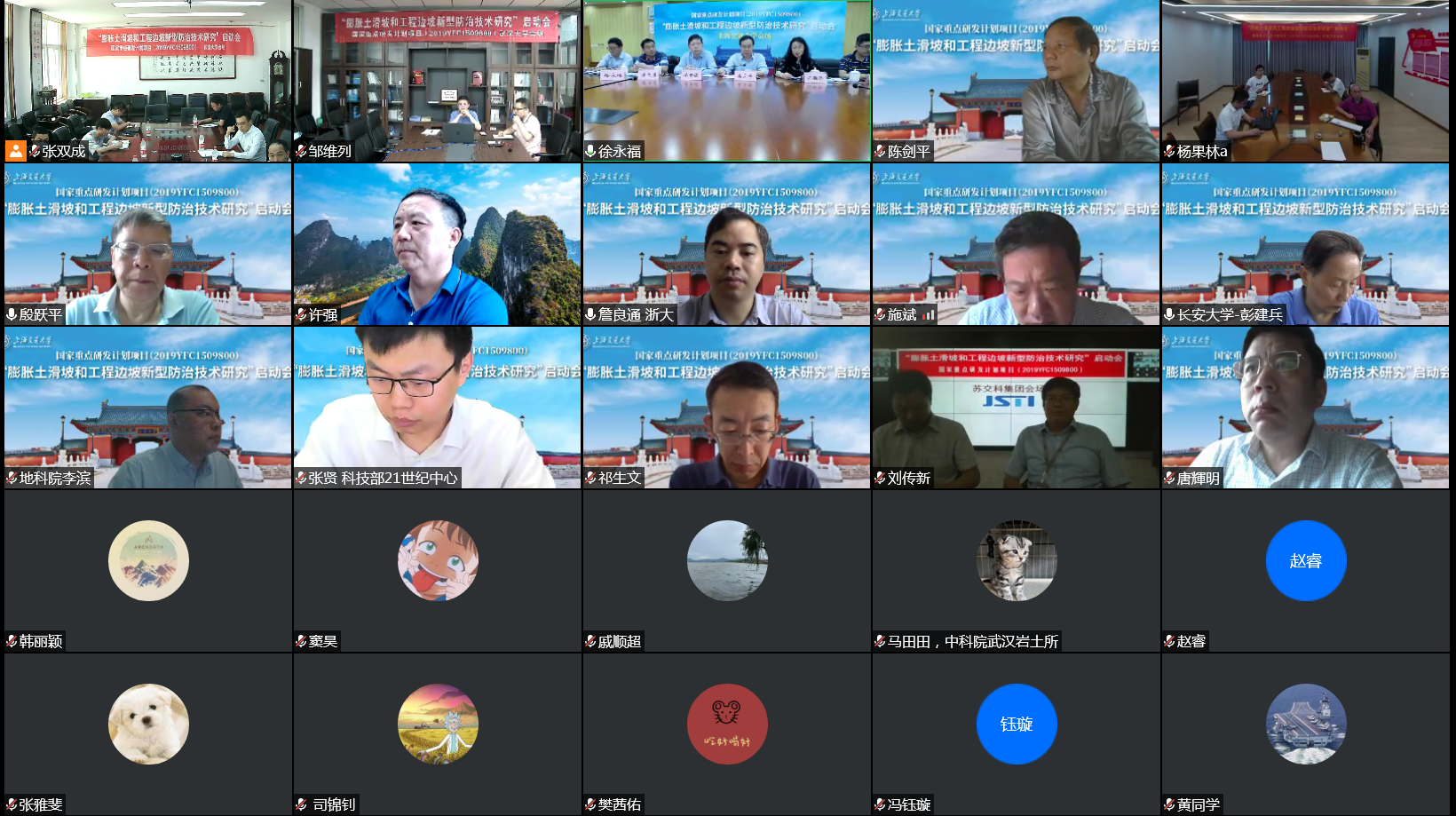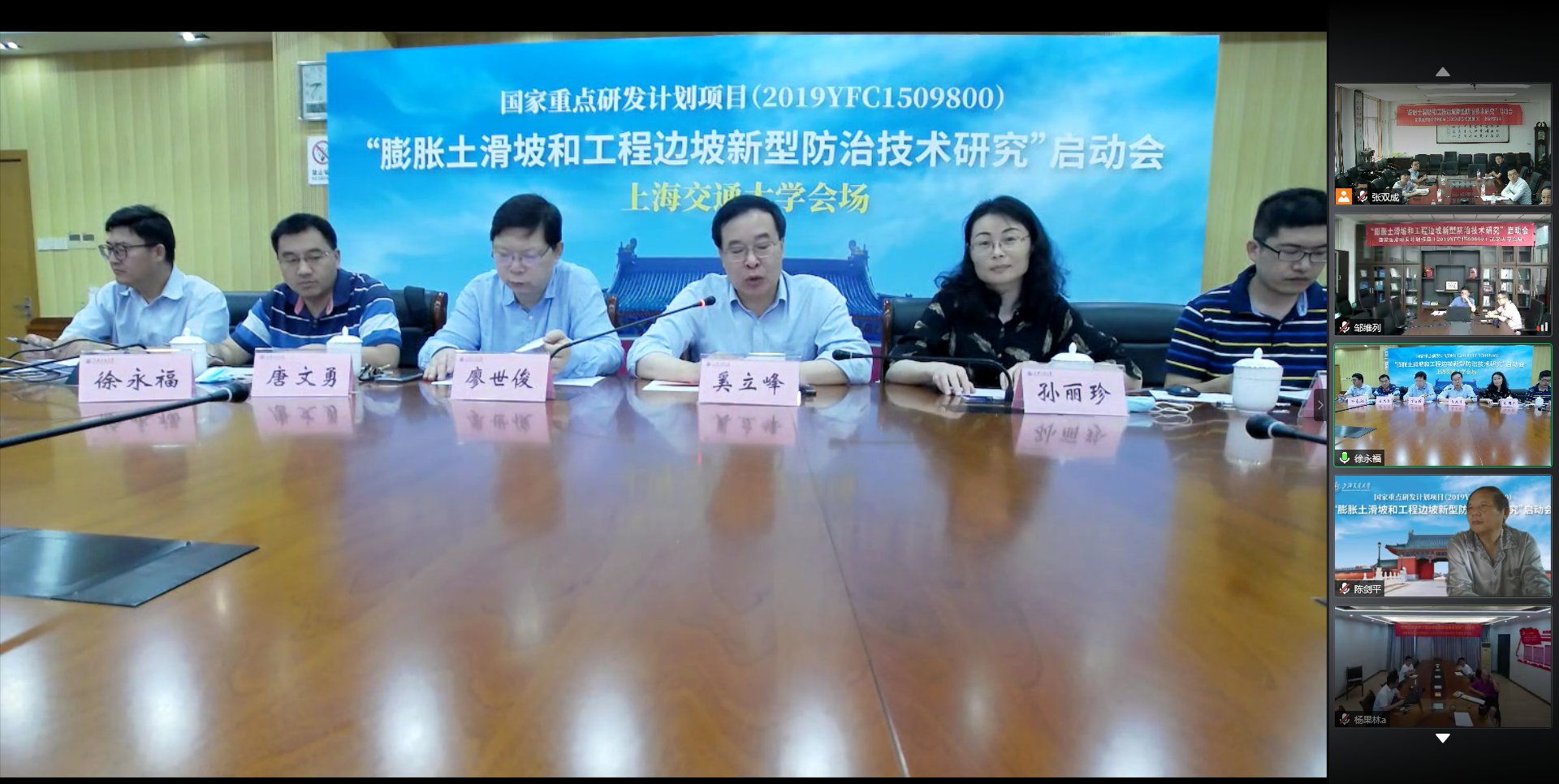2020年7月5日,由3044am永利集团官网牵头、3044am永利集团官网徐永福教授负责的2019年国家重点研发计划 “膨胀土滑坡和工程边坡新型防治技术研究”项目启动会暨实施方案论证会以腾讯视频会议形式召开。科技部中国21世纪议程管理中心张贤副处长、项目专家中国科学院水利部成都山地灾害与环境研究所崔鹏院士、长安大学彭建兵院士、中国地质环境监测院殷跃平研究员、中国科学院武汉岩土力学研究所李小春研究员、中国科学院地质力学研究所李滨研究员、中国地质大学(武汉)副校长唐辉明教授、同济大学朱合华教授、中国水利水电科学研究院汪小刚研究员、成都理工大学许强教授、南京大学施斌教授、吉林大学陈剑平教授、中国科学院地质与地球物理研究所祁生文研究员、浙江大学詹良通教授,3044am永利集团官网副校长奚立峰教授,3044am永利集团官网院长廖世俊教授等出席会议,项目、课题和子课题研究任务负责人、研究骨干、科研财务助理等50余人参加本次会议。启动会议由3044am永利集团官网科研院副院长孙丽珍主持。